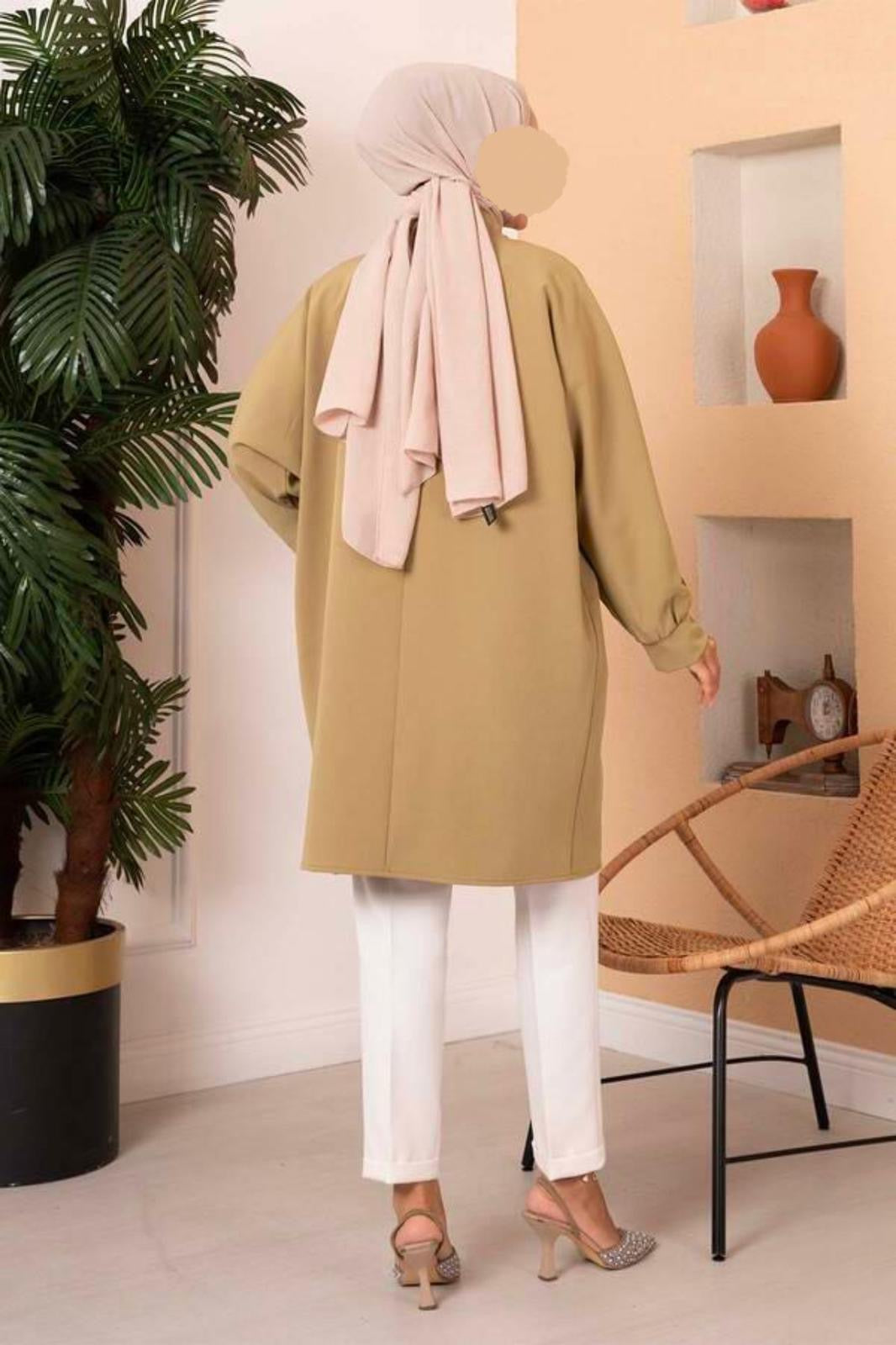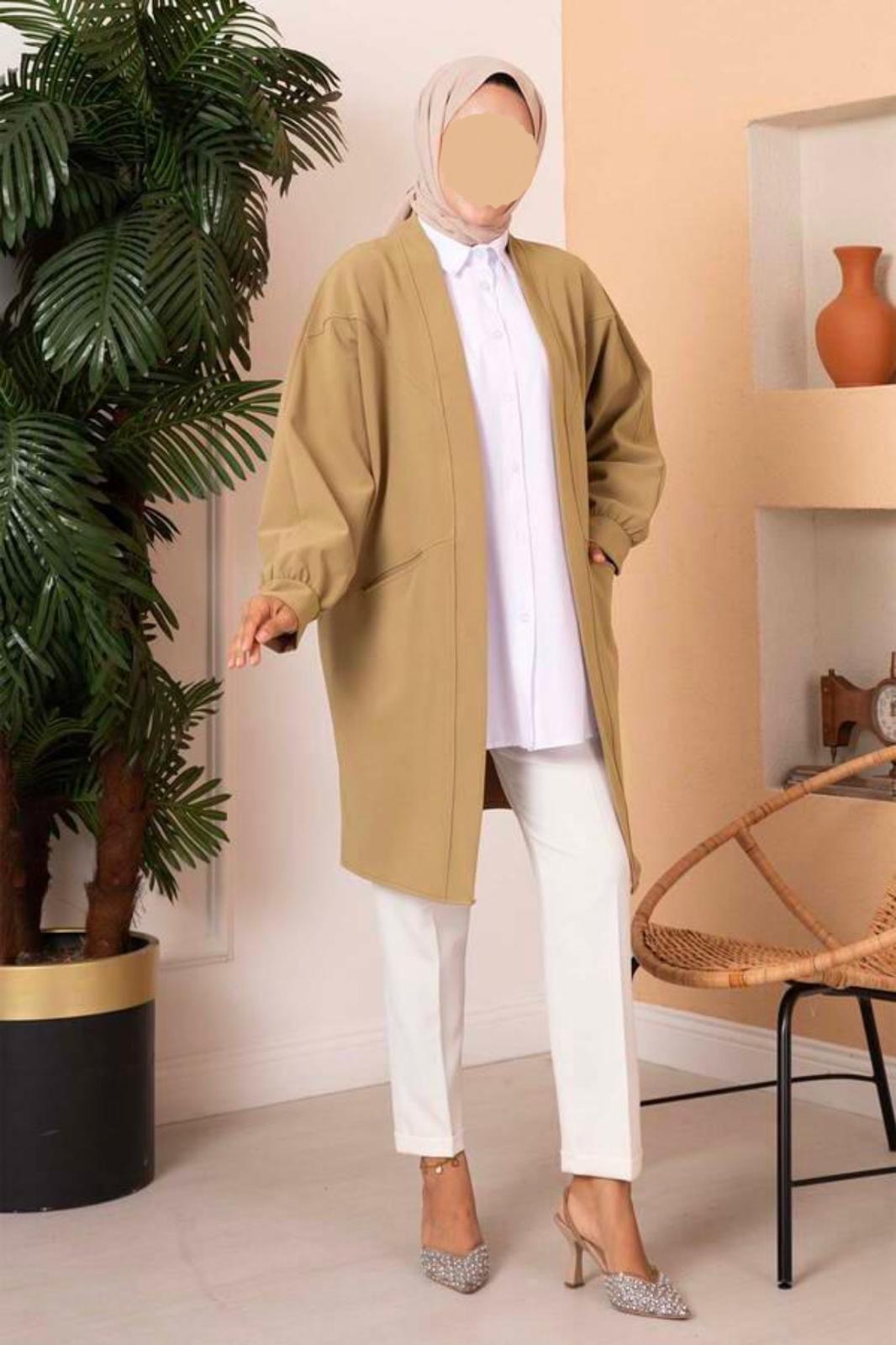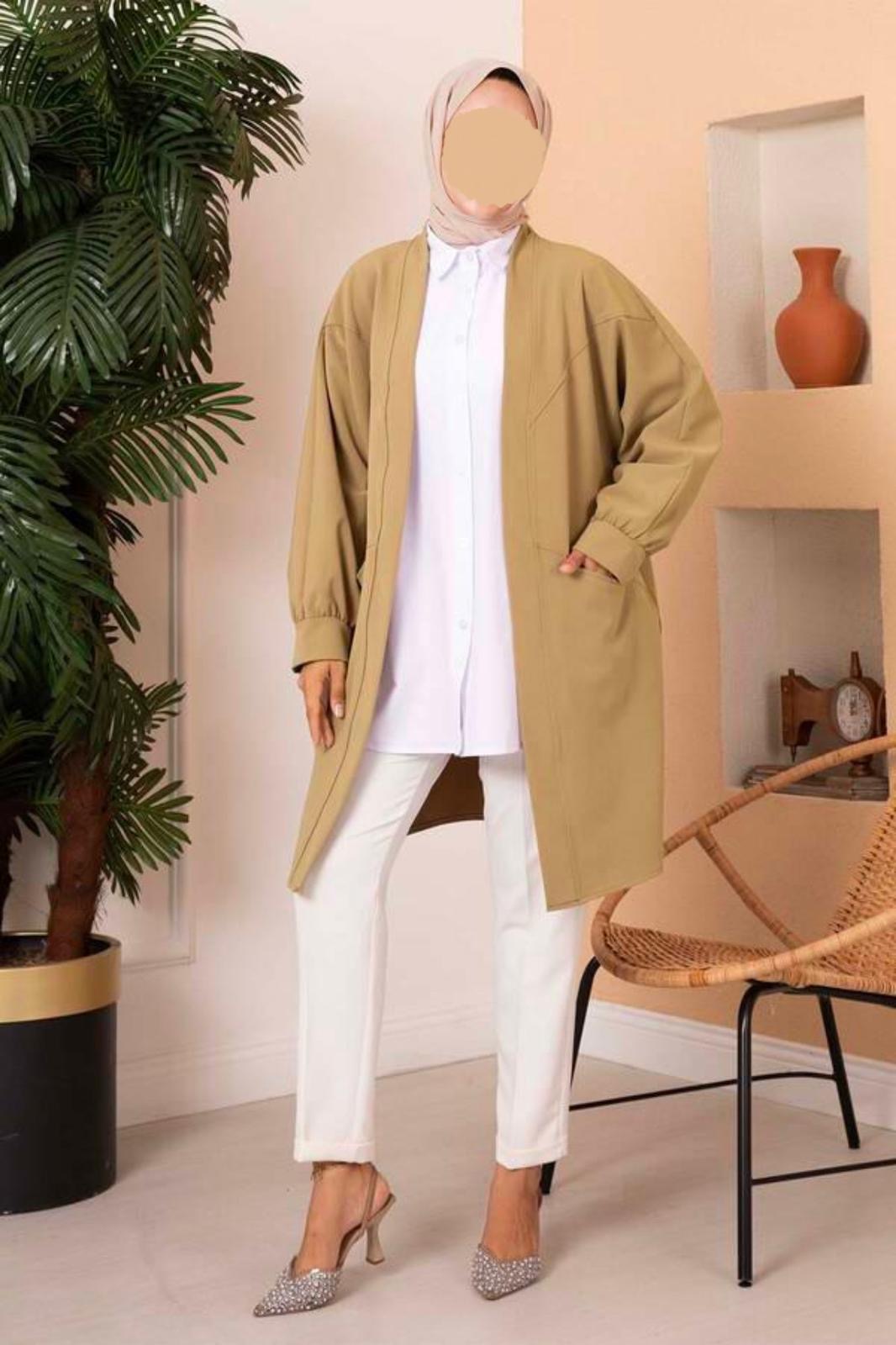 Das Jacke ist saisonal. Es hat Taschen, aber keine Knöpfe oder Reißverschlüsse. Es ist locker geschnitten.