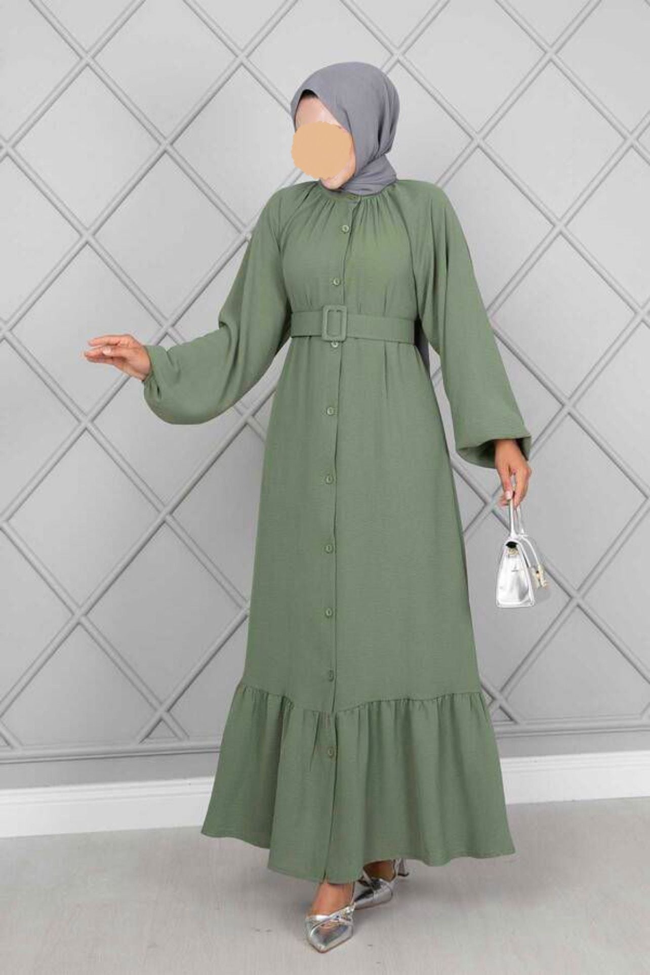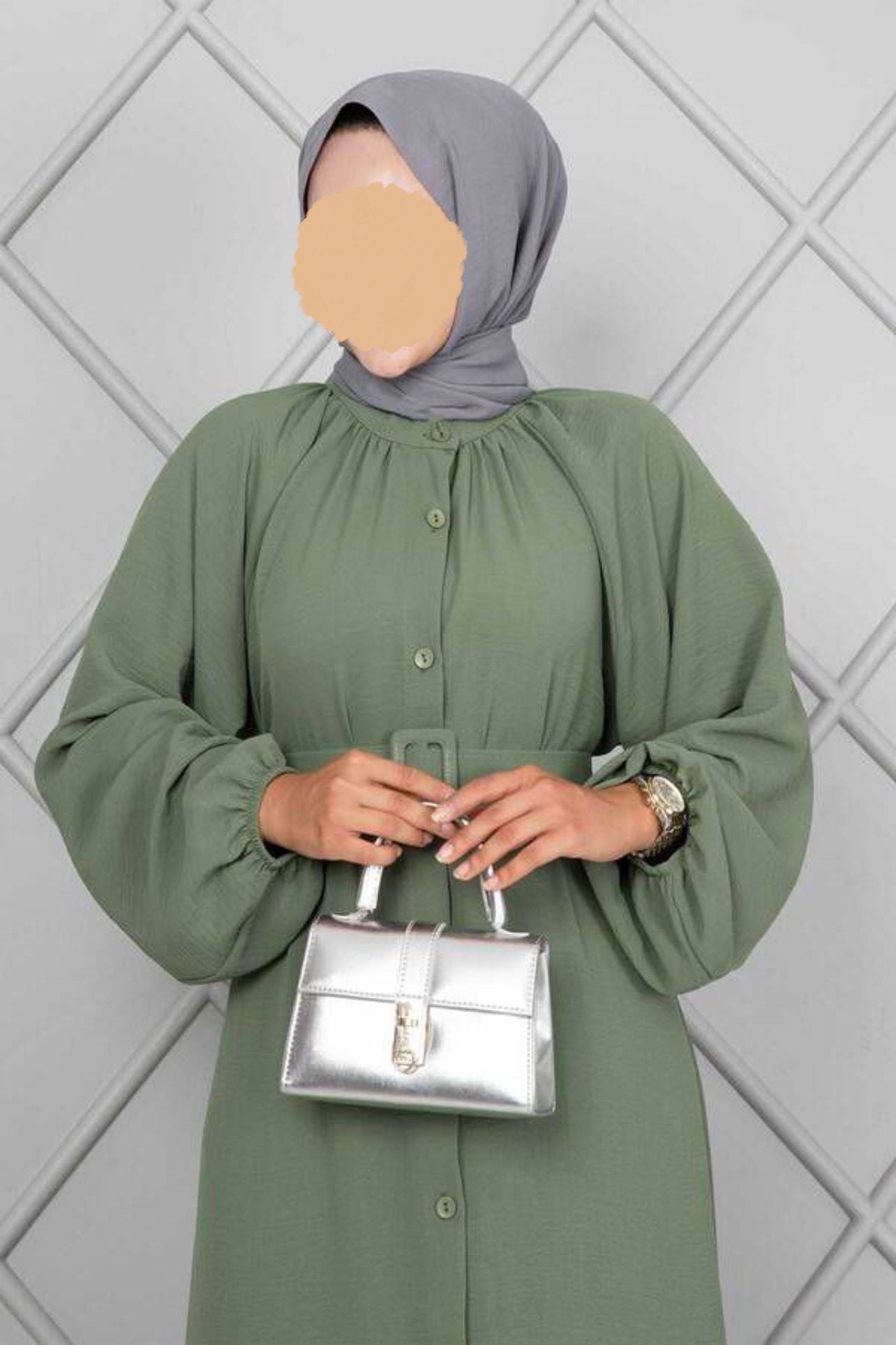 Das Kleid ist saisonal. Es handelt sich um einen Artikel mit Rundhalsausschnitt, durchgehender Knopfleiste und elastischen Ärmelmanschetten. Der Gürtel ist abnehmbar.